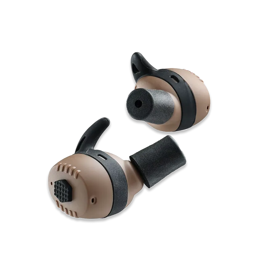 Field Ops Pro uses intelligent dual-protection technology with built-in microphones that amplify ambient sounds up to 4X. When a loud noise above 82dB is detected (like a gunshot), the earbuds instantly suppress it to safe levels in just 0.01 seconds—faster than you can blink. You hear every footstep and turkey gobble clearly, but gunshots sound like distant pops.