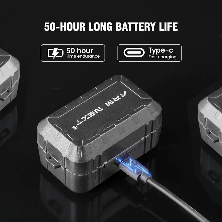 Up to 50 hours total with the charging case. The earbuds get about 8 hours per charge, and the rugged case holds multiple recharges. USB-C fast charging gets you back in the field quickly.